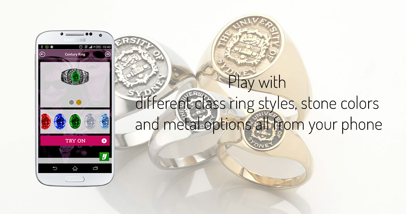 · Play with different class ring styles, stone colors & metal options all from your phone.