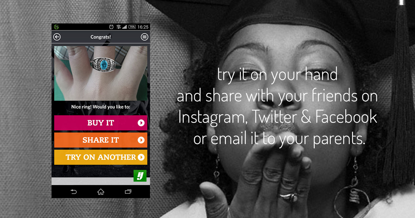· Ability to choose a class ring and then virtually try it on your hand and share with your friends on Instagram, Twitter & Facebook or email it to your parents.